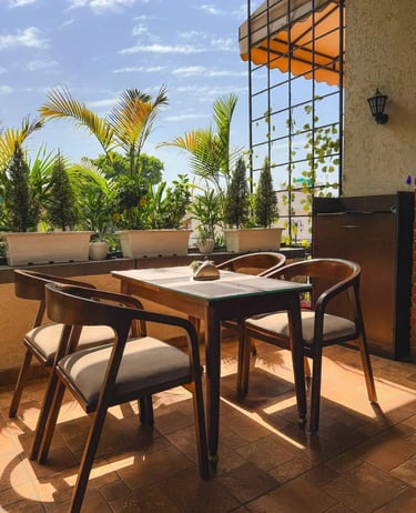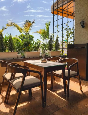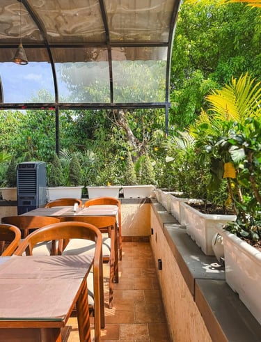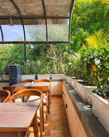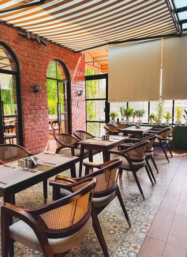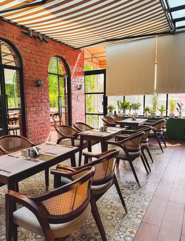 Azara Home designed this café to blend rustic charm with lush greenery.